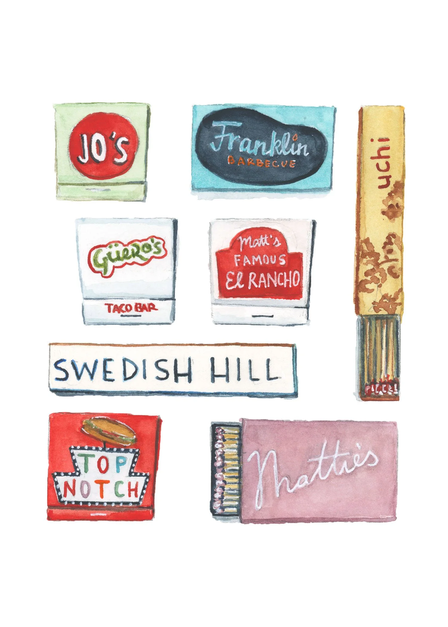 Framebridge commissioned a custom illustration for the opening of their South Lamar Austin location, a matchbook composition featuring beloved local restaurants and landmarks. The piece served as a visual anchor for the new store, celebrating Austin through a curated, design forward lens.